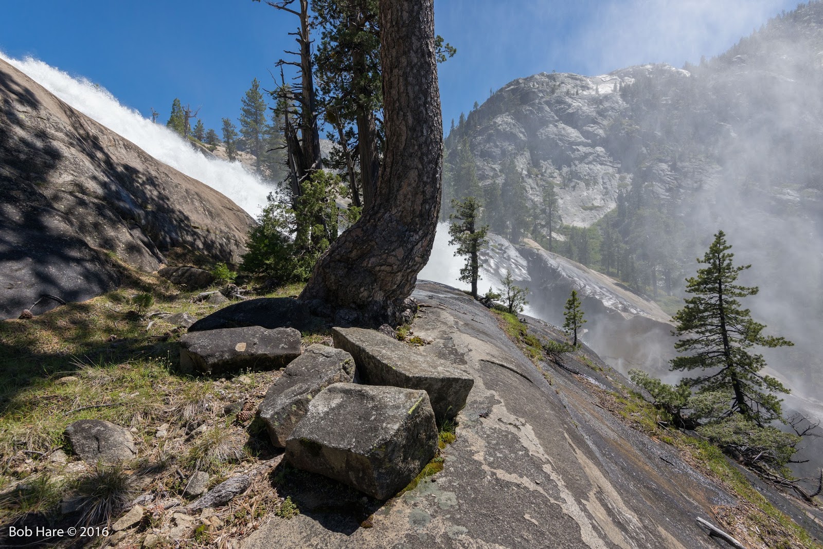 I don't know how Adams made it down the slope with his huge view camera and tripod. I carefully, and with some trepidation, approached the roaring waterwheel and wedged myself into the same rocks that appear in Adams' photo (with a few new ones that have rolled down in the intervening decades). My "selfies" show my emotional transition from initial fear and endurance to elation at being "baptized" by the roaring Tuolumne.